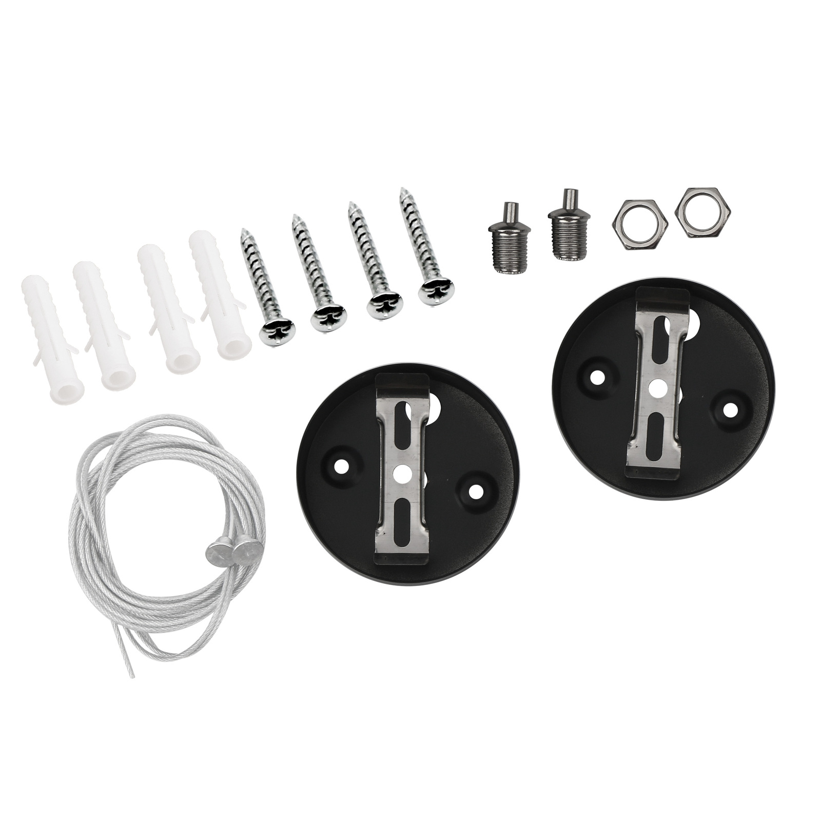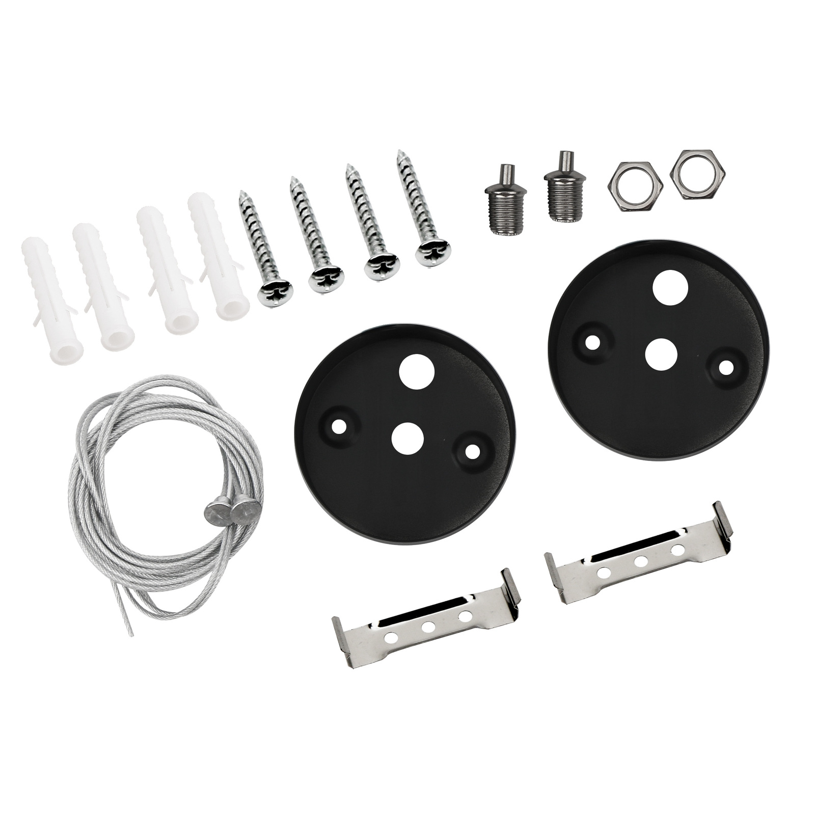 (2 троса , 2 потолочные чаши, 2 скобы для светильника, 2 стопорных механизма к ним, 2 гайки для фиксации в чашах, 4 самореза , 4 дюбеля)
